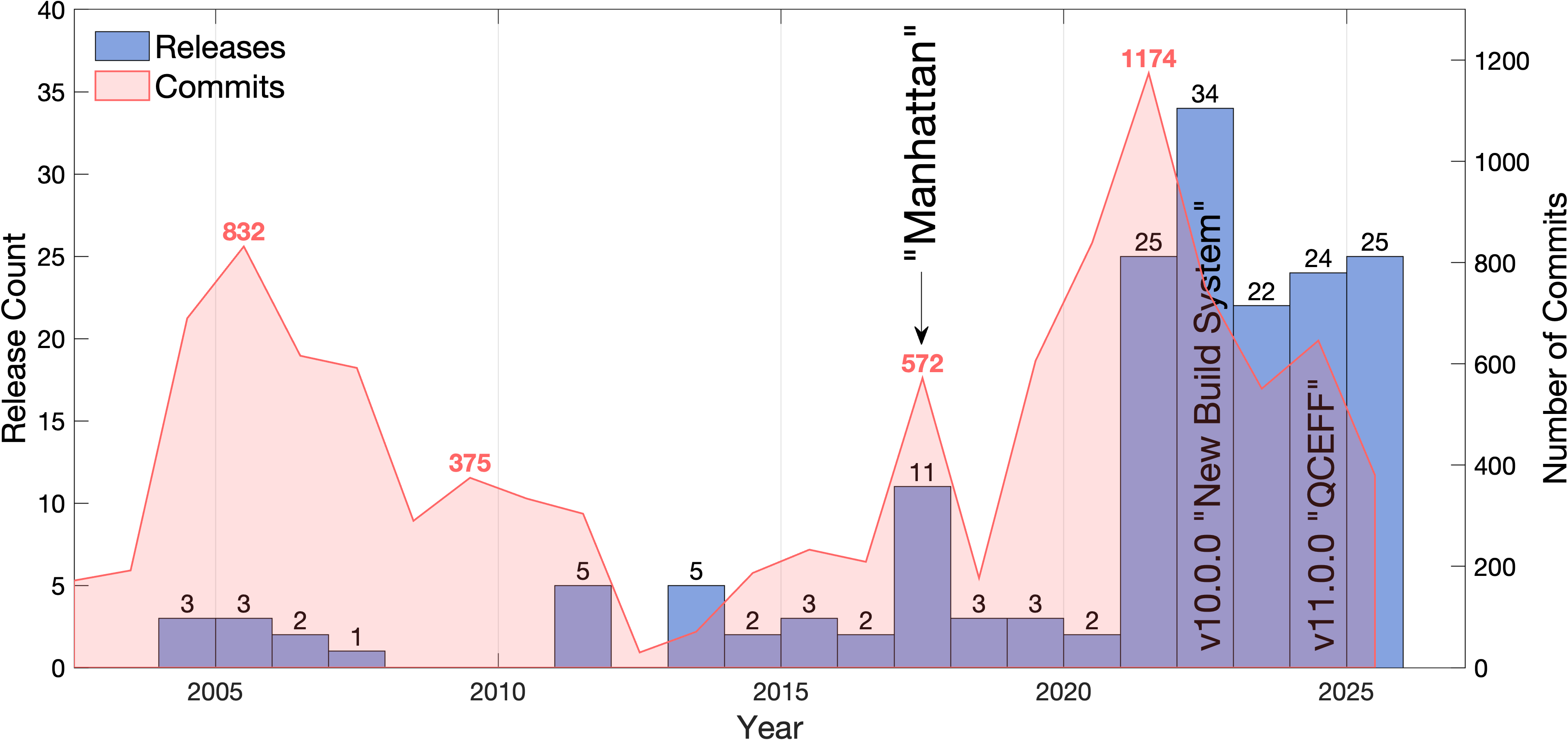Since the Manhattan release (v9.0), DART has averaged ~700 commits and ~16 releases per year. Most of the code updates are backwards-compatible, ensuring that user codes continue to run unchanged while still benefiting from new capabilities. The bar chart below shows the number of releases per 12-months interval, while the shaded area represents the commit activity over the same period. Major releases such as Manhattan, v10.0, v11.0 are also annotated. This image highlights the relationship between code-release milestones and overall development activity.